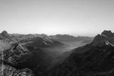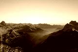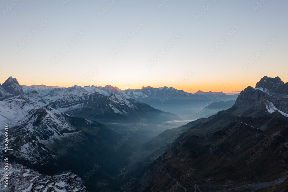 Amazing shot of a beautiful landscape in the alps of Switzerland. Wonderful flight with a drone over an amazing landscape in the canton of Glarus. Epic view at sunset.