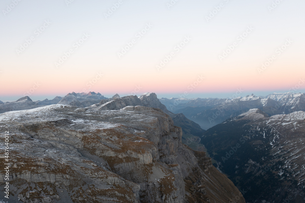 Amazing shot of a beautiful landscape in the alps of Switzerland. Wonderful flight with a drone over an amazing landscape in the canton of Glarus. Epic view at sunset.