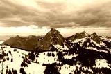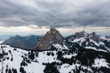 Amazing shot of a beautiful landscape in the alps of Switzerland. Wonderful flight with a drone over an amazing landscape in the canton of Schwyz. Epic view over a region called Mythenregion.