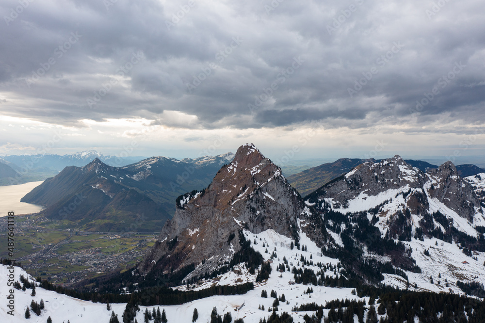 Amazing shot of a beautiful landscape in the alps of Switzerland. Wonderful flight with a drone over an amazing landscape in the canton of Schwyz. Epic view over a region called Mythenregion.
