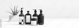 3D render product mockup, set of Aroma spa containers pump amber round bottle and jar arrange on white background with green leaves plants. Blank label, Bottles, Packaging, Bath and body, Skincare.