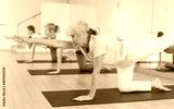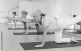 Active senior woman exercising stretching workout and incline during yoga class in fitness studio