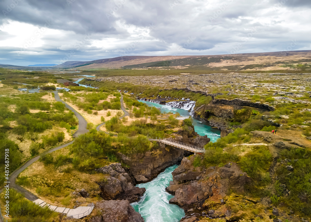 Aerial view of rock formations and erosion at Barnafossar water falls in rural Iceland.