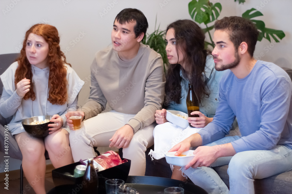 Friends sitting on sofa and watching football match on TV. Excited men and women cheering for team at critical moment, drinking beer and eating popcorn at home. Entertainment, emotion concept