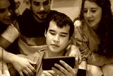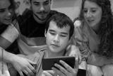 Multiethnic friends watching sports game on phone in living room. Medium shot of excited men and women sitting on coach, having get together on weekend. Friendship, entertainment concept