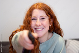 Beautiful smiling girl holding remote and switching channels. Front view of happy woman posing for camera, watching TV on weekend at home. Emotion, entertainment concept