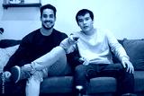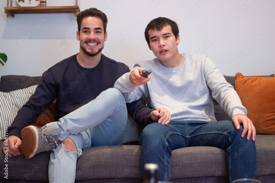 Excited sports fans sitting on sofa and watching TV. Smiling men switching channels, watching sports games, football or soccer match on television, cheering sports team. Entertainment, emotion concept