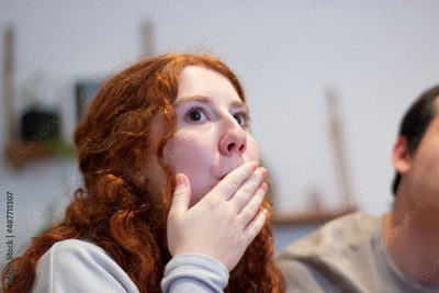 Surprised girl covering mouth with hands while watching TV. Close-up shot of beautiful shocked sports fan watching tense moment of football match on television. Entertainment, emotion concept