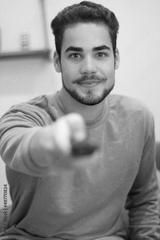 Handsome man looking at camera and switching TV channels at home. Front view of bearded Caucasian man spending time at home, watching football match, sports games on television. Entertainment concept
