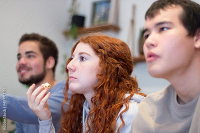 Multiethnic friends watching sports games on TV at home. Close-up shot of men and woman eating popcorn, supporting team, watching tense soccer match, spending time together. Entertainment concept