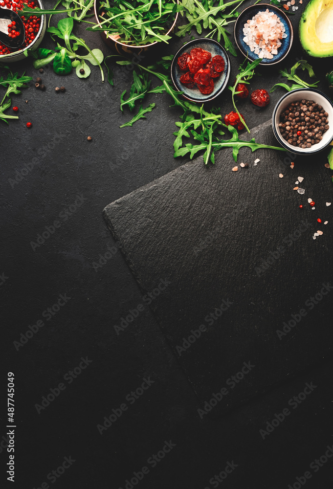 Healthy clean eating food layout and diet nutrition concept. Pineapple, vegetables, dried fruits, greens and other ingredients for salad preparation on black table background with slate board, top