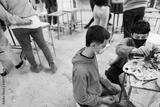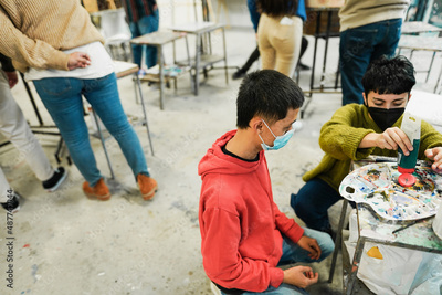 Multiracial students painting inside art room class wearing safety masks - Focus on asian boy
