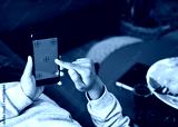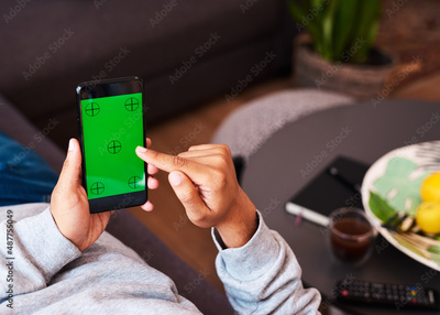 Over the shoulder shot of a man scrolling on a mobile phone with a green screen