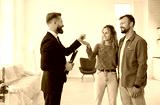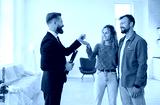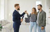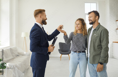 Real estate agent gives house keys to young married couple. Happy boyfriend and girlfriend or husband and wife standing in living room of new partially furnished apartment take keys that realtor gives