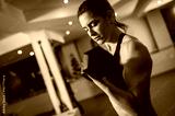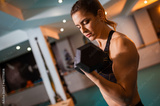 A beautiful woman in the gym and training exercises with dumbbells
