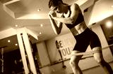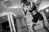 A woman in the gym exercises her legs with a rubber band
