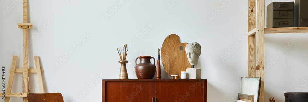 Stylish composition of artist workspace with design retro teak commode, chair, bookcase, poster frames, easel, decoration and elegant personal accessories. Template.