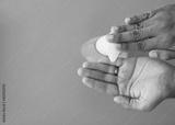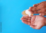 An overhead shot of a man dispensing soap against a blue background