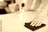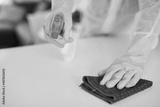 A cleaning professional sprays a kitchen counter with sanitiser