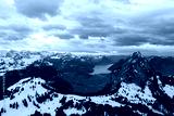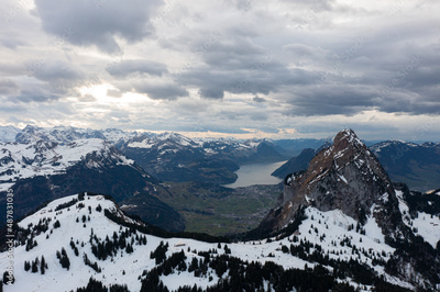 Amazing shot of a beautiful landscape in the alps of Switzerland. Wonderful flight with a drone over an amazing landscape in the canton of Schwyz. Epic view at a mountain called Grosser Mythen.