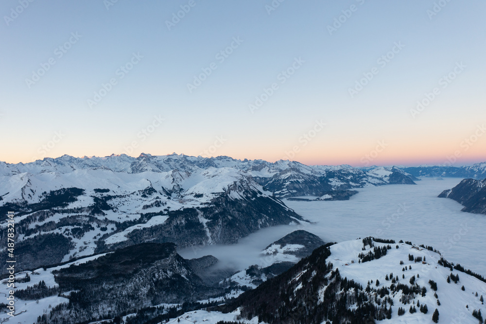 Amazing sunrise with red sky and a beautiful landscape in the wonderful region in Switzerland called Mythenregion. Beautiful mountain called Mythen and an epic sea of fog in the background.