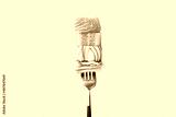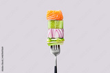 Close-up of fork with food on it: delicious fillet salmon, cucumber, onion, green salad on gray color background. Concept of healthy diet and clean eating with fish and vegetables, balanced nutrition