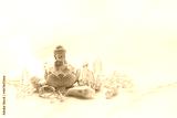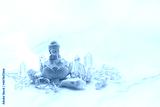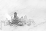 Clear quartz minerals and little Buddha statue on light marble background. gemstones crystals for healing esoteric ritual, spiritual Magic practice, relaxation and meditation. life balance concept