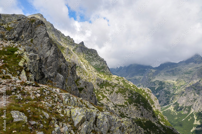 View of sharp green mountain and rock landscape with low clouds over the peaks in High Tatras, Slovakia