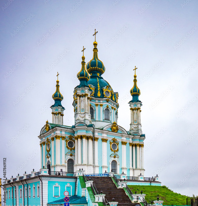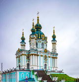 Beautiful St. Andrews Cathedral with gold laden decorations on the domes in Kiev