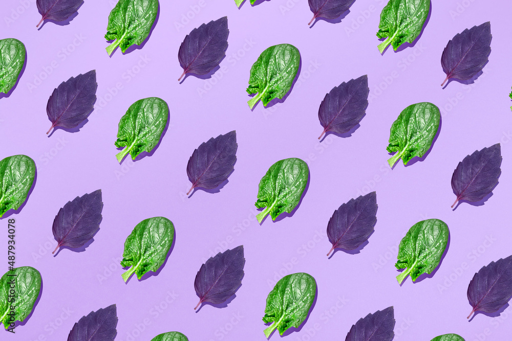 Spinach and basil leaf on colored background. Spinach and basil pattern, flatlay, top view