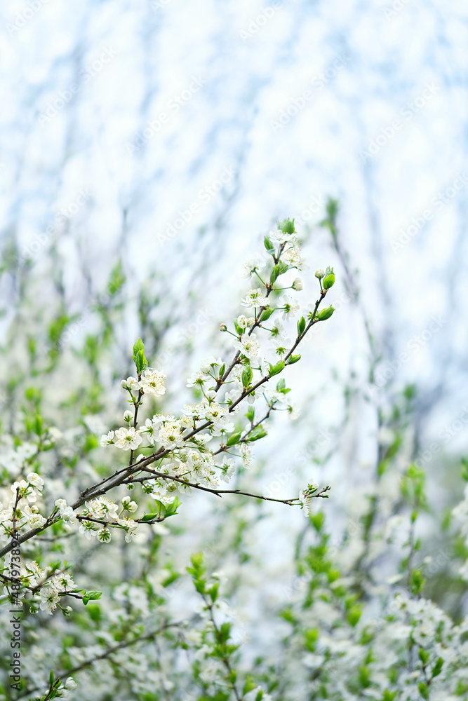 blossoming cherry trees in garden, abstract gentle natural background. floral spring season concept.