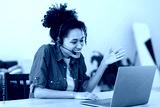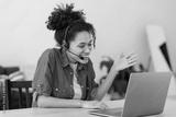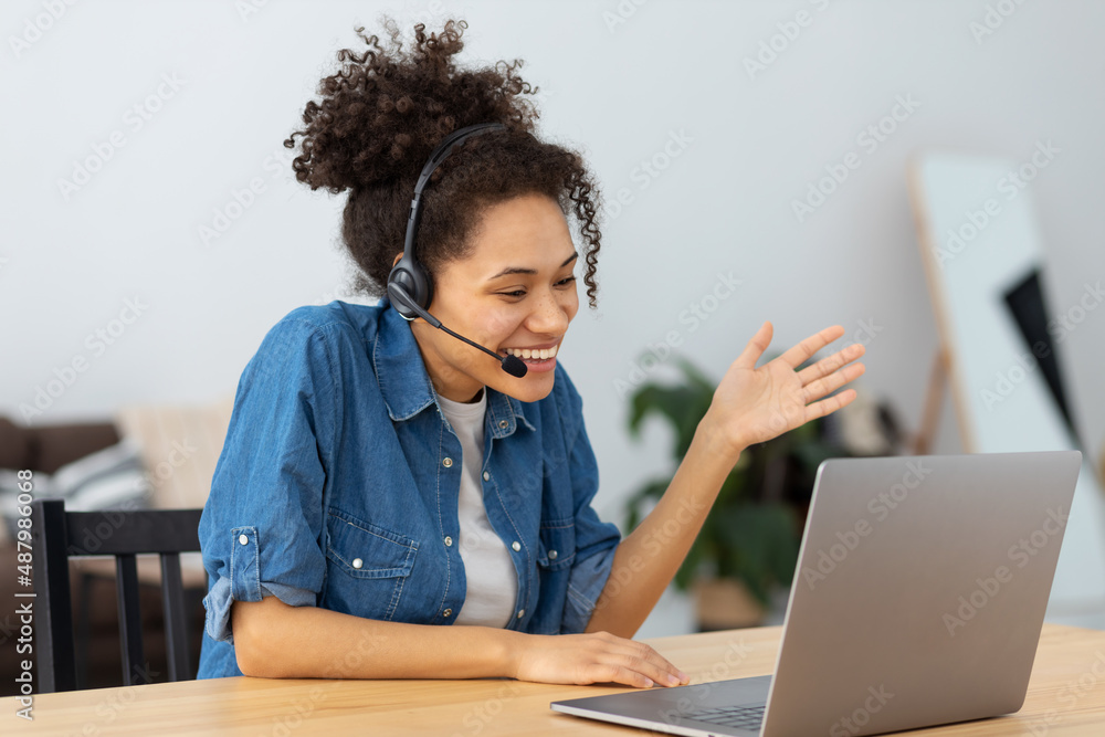 Happy African American female employee customer support services in headset, online consultation. Call center. Female student in headphones using laptop computer having video call. Online learning