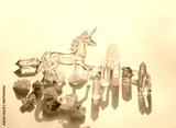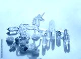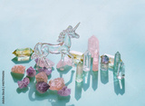 Magic minerals and crystal unicorn on abstract light blue background. gemstones for healing Crystal Ritual. Witchcraft, Esoteric, spiritual practice. life balance concept