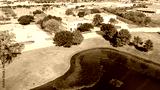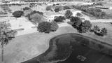 Top view office building and commercial warehouse near algae blanket lily pad pond in Carrollton Texas, USA