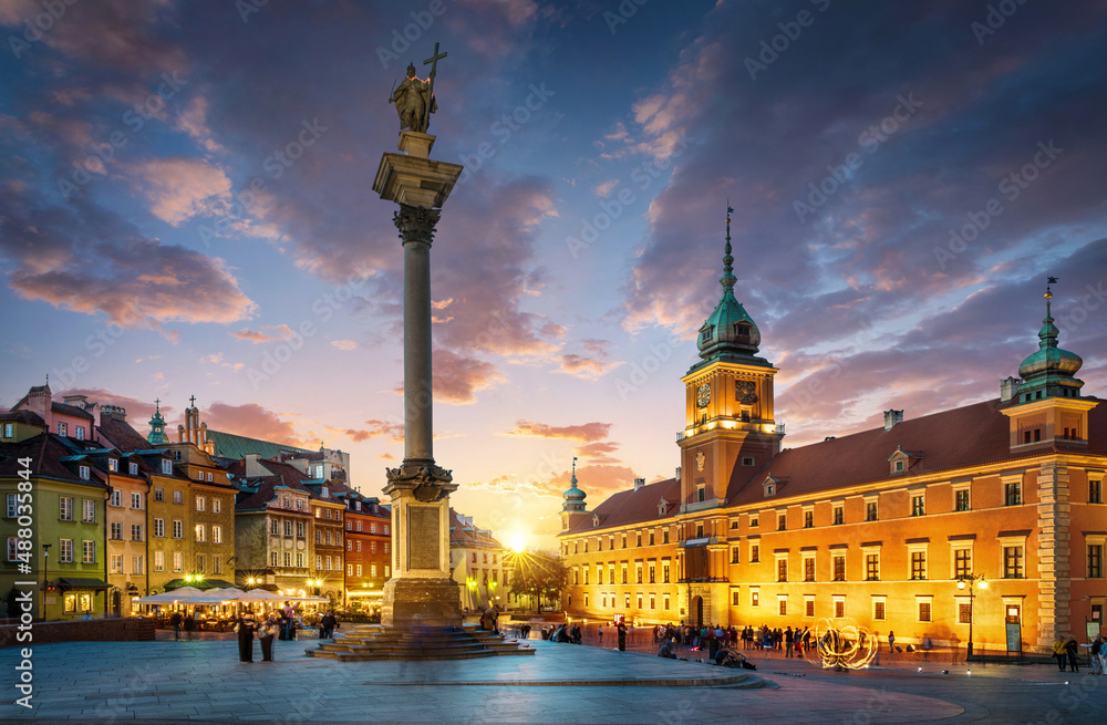 Royal Castle, ancient townhouses and Sigismund's Column in Old town in Warsaw, Poland. Night view, long exposure.