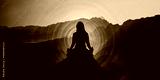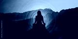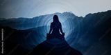 Silhouette of a woman in the lotus position and space, meditation, yoga. Mountain horizontal infinity background. Sunset. Blue hues. Mystical. Spiritual. Meditation on high mountain.