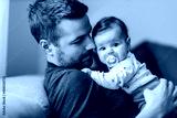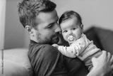 Father holding baby girl in arms while sitting on sofa.