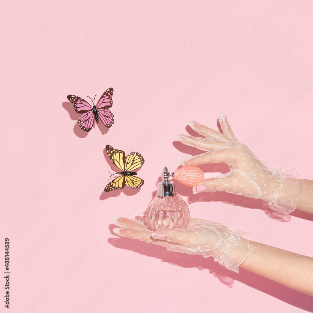 Spring creative layout with woman hands holding perfume bottle and colorful butterflies on pastel pink background. 80s, 90s retro romantic aesthetic summer concept. Minimal surreal fashion idea.