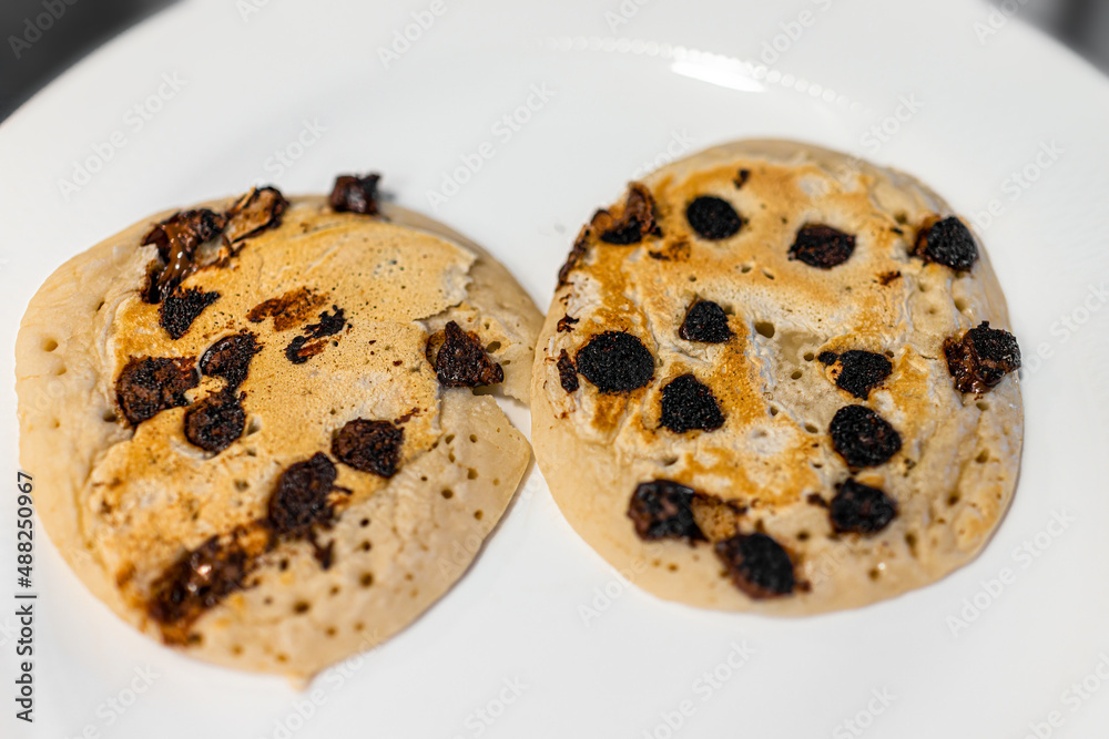 Macro closeup above view of two buttermilk dark chocolate chip pancakes on plate as traditional breakfast brunch dessert