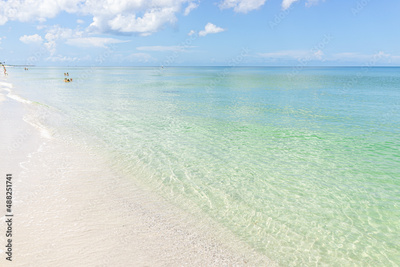 Naples access beach in southwest Florida with unrecognizable people relaxing in water far in distance on summer sunny day with blue sky on gulf coast