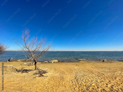 Unidentified children in winter jacket playing along the sandy rocky shoreline of Lake Lewisville in wintertime, Texas, USA