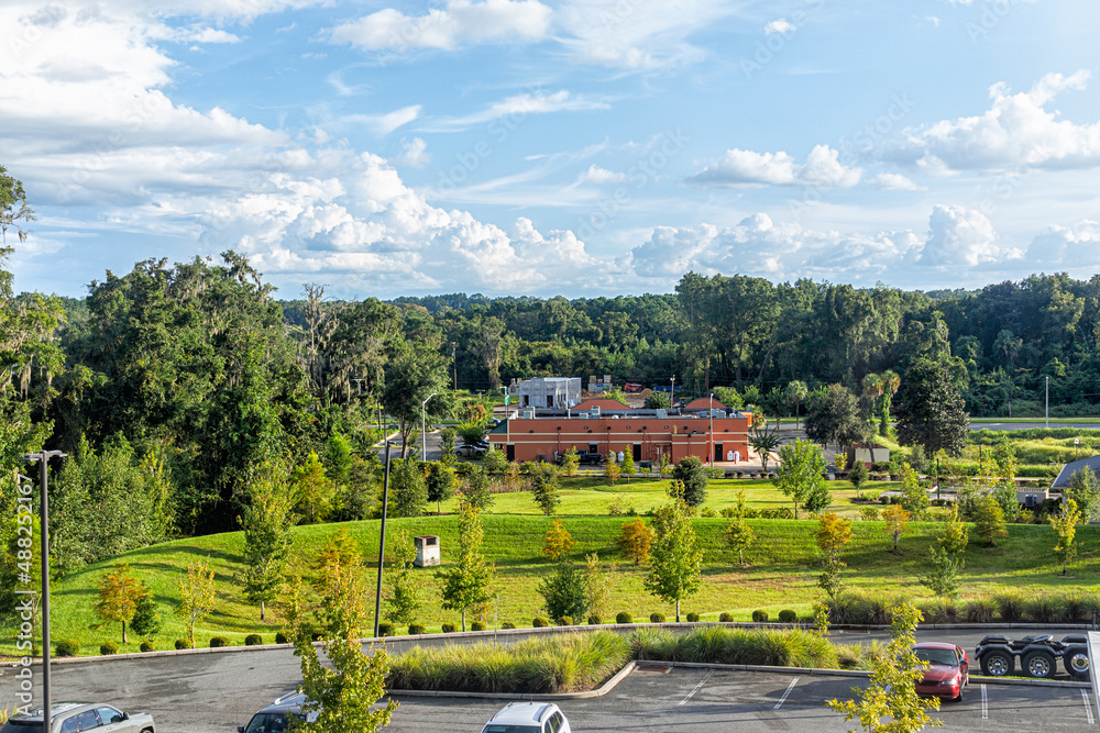 High angle view of summer landscape in Alachua, Florida near Gainesville with building cars parking lot and green trees with blue sky