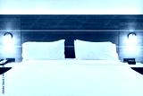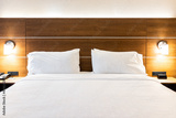 Bedroom empty room with illuminated lit lamp light and front view of white pillows with sheets on mattress bed headboard in modern hotel with nobody