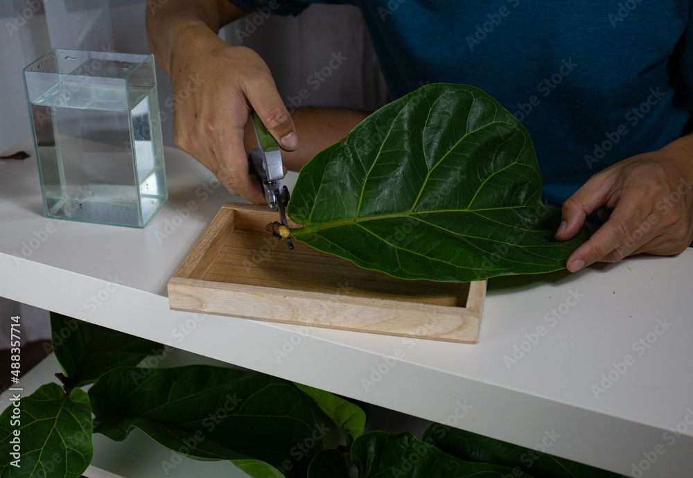 A man is using pruning shears to cut the leaves of the Fiddle-leaf fig. to be propagated by cuttings in water. Fiddle-leaf fig Can be used as a home decoration plant.