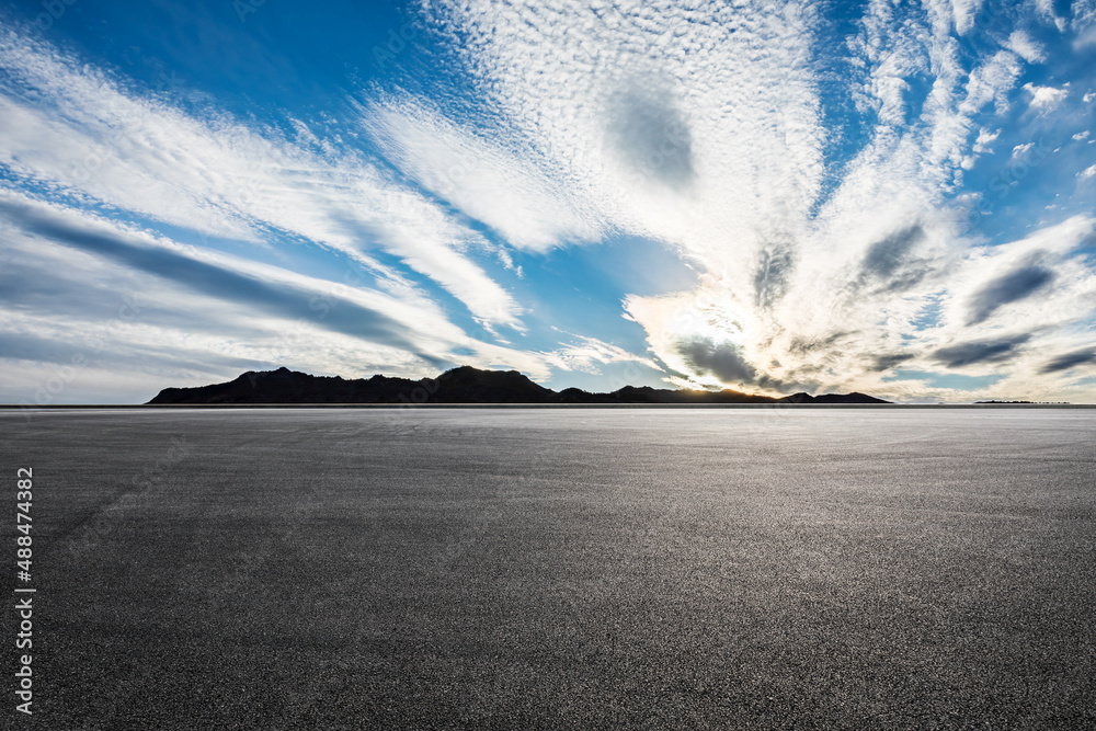 Asphalt road and mountains with beautiful clouds at sunrise