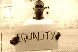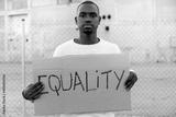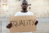 Young African American man looking at camera holding cardboard sign: Equality. Human rights activist.