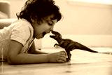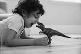 Adventurous young boy imitating a t-rex dinosaur toy at home