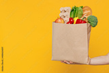 Close up cropped deliveryman hold in hand arm craft bag with food vegetables isolated on plain yellow color wall background studio portrait. Service delivery concept. Copy space advertising mock up.