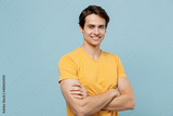 Young smilig happy cheerful confident man 20s wearing yellow t-shirt hold hands crossed folded looking camera isolated on plain pastel light blue background studio portrait. People lifestyle concept.