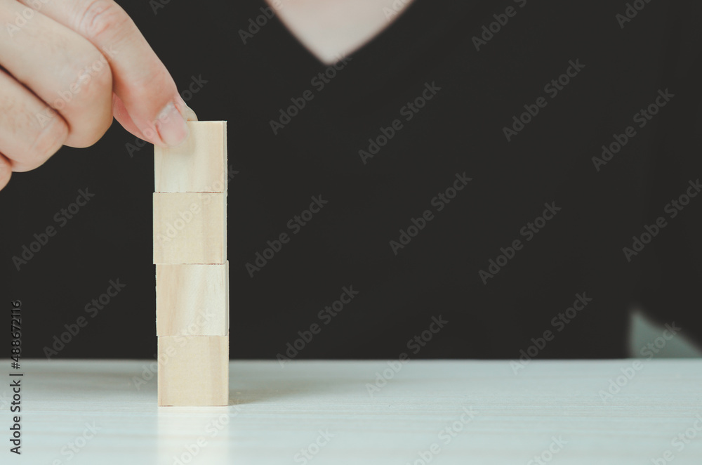 Hand putting and stacking blank wooden cubes for icons or symbols.
